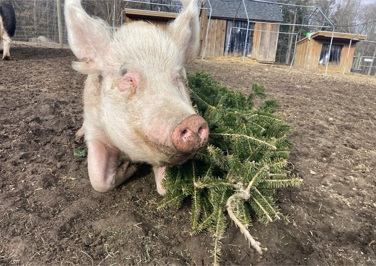 Your tree is safely dismounted from the stand and the area cleaned. Experience sustainable pig-powered recycling - pigs devour your tree, turning it into nutrient-rich compost. Yum!